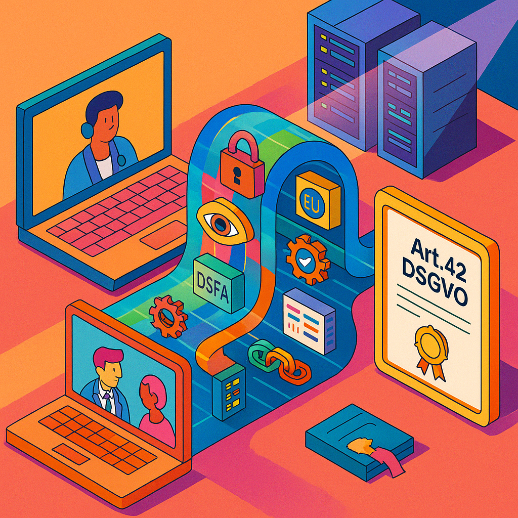 Den Nachweis über die Einhaltung der Anforderungen soll – so steht es ausdrücklich seit 2021 in der Anlage 31b – über ein Zertifikat nach Artikel 42 DSGVO erfolgen. Leider gab es über Jahre hinweg ein unüberwindbares Hindernis zur Erlangung eines solchen Zertifikats: Keine Zertifizierungsstelle war durch die Deutsche Akkreditierungsstelle DAkkS oder eine andere europäische Stelle berechtigt, ein solches Zertifikat nach Artikel 42 auszustellen. Die Übergangsfrist, während die Anbieter von Video-Sprechstunden ihre Konformität per ISO/IEC 17065-Zertifikat oder Selbstauskunft nachweisen konnten, wurde daher immer wieder verlängert. Erst im April 2025 erhielt datenschutz-cert die Akkreditierung.